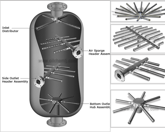 Hub Laterals can be designed for disc head vessels enabling the system to collect completely to the bottom of the vessel. Header Laterals design are also available for flat bottom vessel distributor or collector applications. Systems can be designed to accommodate side, center, top or bottom inlet piping. Integral backwash systems can be designed for any hub and header lateral for fast effective and efficient cleaning. Connections of the laterals can be flanged or threaded. All systems are designed for effective liquid or solid retention in a wide range of applications including exchangers, clay and sand filtration applications, carbon towers and power plants with water systems.